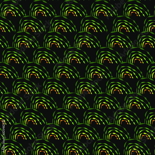 dark background with abstract ornaments in the form of dark green and orange waves, seamless pattern, vector