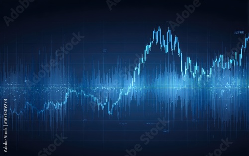 Dark background with light blue stock market graphs and technical indicators