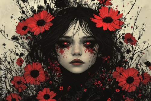 Dark beauty surrounded by vibrant red flowers with haunting eyes and striking features captured in an artistic portrait