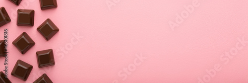 Dark black chocolate pieces on light pink table background. Pastel color. Wide banner. Closeup. Empty place for text. Top down view.