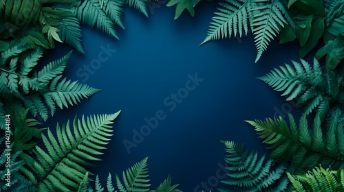 Dark blue background with fern leaves in the corners, empty center for text or product display, nature-inspired backdrop