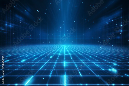 Dark blue background with light beams and glowing lines, creating an abstract, tech-inspired visual effect. The glowing lines create depth in the dark space.