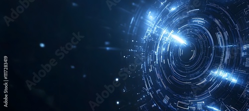 Dark blue background with white futuristic technology and digital connection lines, banner design for website header,