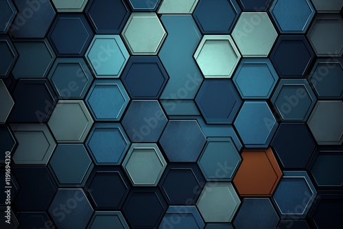 Dark blue hexagonal patterns create a striking abstract design, emphasizing geometry and depth with a notable orange hexagon among the blues, perfect for digital backgrounds or art