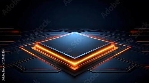 Dark blue square platform with orange neon lights, futuristic tech background.