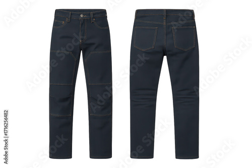 Dark blue work pants isolated on transparent background, front and back view
