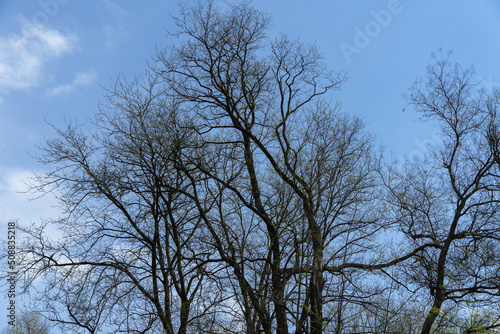 Dark branches and trunk on the blue sky background. Tree of life. Nature early spring. Natural wallpaper and texture. Sadness and charm concept.