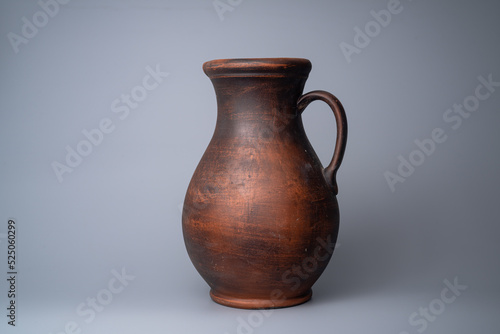 Dark brown jug with a handle, handmade jar from clay on a gray background in the studio. Earthenware for drink and food. Kitchen utensils. Old rustic cookware made of earthen. Retro craft vessel.