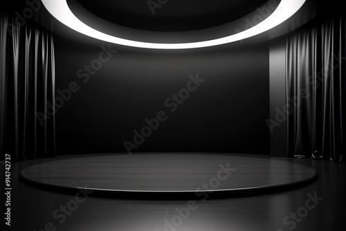 Dark circular stage with glowing ring.