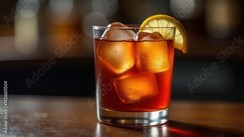 Dark cocktail with ice cubes and mint garnish served in a lowball glass on a wooden bar counter, evoking bold flavor, chill vibes, and classic bar elegance.