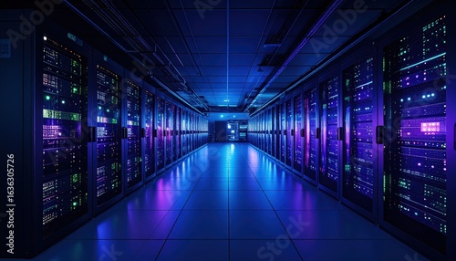 Dark colorful servers center room with computers and storage systems