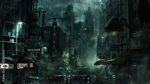 Dark Dystopian Cityscape with Futuristic Architecture and Atmosphere