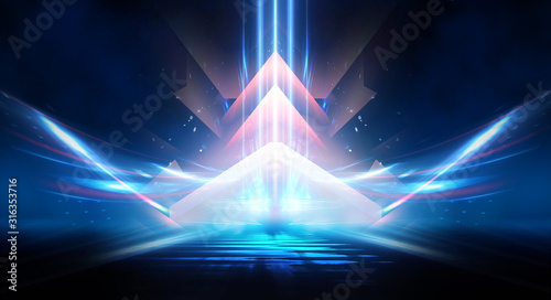 Dark empty abstract scene, rays of searchlights, neon blue light, highlights and lights. Night view of the scene, a tunnel with illumination. Dark background with spotlights.