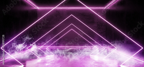 Dark Empty Virtual Vibrant Fluorescent Neon Glowing Purple Blue Triangle Line Shaped Gate Stage Laser Lights Reflection Grunge Concrete Room Rough Texture 3D Rendering