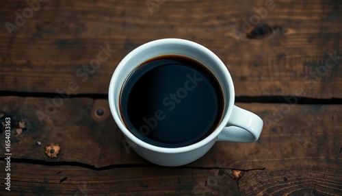 Dark espresso in a pristine white cup rests on a rustic wooden table, hot drink, italian coffee