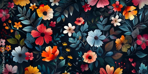 Dark floral background wallpaper design with multicolor flowers and leaves