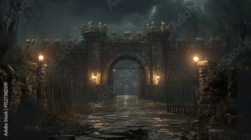 dark fortress gate with raised drawbridge, surrounded by eerie trees and fog