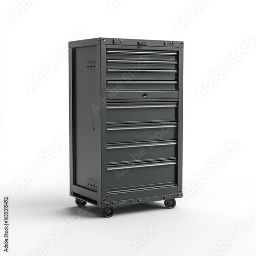 Dark gray metal storage cabinet with multiple drawers and wheels