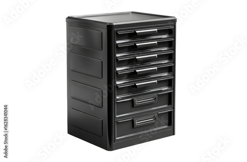 Dark gray plastic storage cabinet with multiple drawers