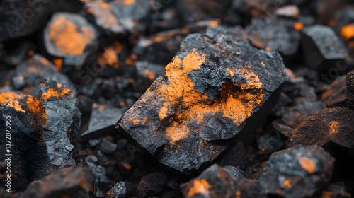 Dark Gray Rocks with Orange Mineral Deposits Close Up Texture Background