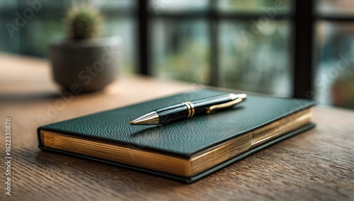 Dark green notebook with gold trim, pen resting on a wooden table. Blurred background of window and plant