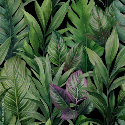 Dark Green palm leaf. Tropical plants. Watercolor botany. Decor composition of botany, monstera, flowers in the jungle