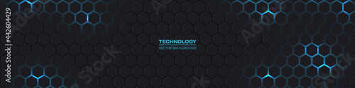 Dark grey and blue horizontal hexagonal technology abstract vector background. Blue bright energy flashes under hexagon in futuristic modern technology wide banner. Dark grey honeycomb texture grid.