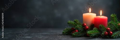 Dark grey background with four candles and fir, , christmas decorations, fir branches