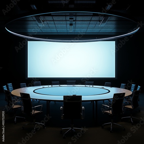 Dark Interior of an IT round table conference room. a wide empty projection area is seen from a projector.