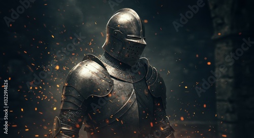 dark knight, medieval armor, glowing helmet, cinematic lighting, ethereal particles, mysterious atmosphere, fantasy warrior, shadowy background, intricate details, metallic textures, golden accents, d