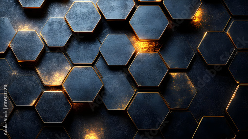 Dark Metallic Hexagon Pattern with Golden Sparks Abstract Background