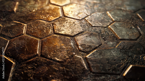 Dark metallic honeycomb texture with warm highlights and deep shadows