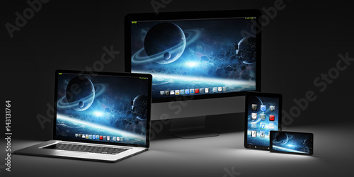 Dark modern computer laptop mobile phone and tablet 3D rendering