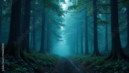 Dark, mysterious forest, towering trees, dense canopy, twilight, eerie, roots