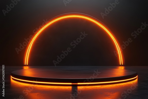 Dark Platform with Glowing Orange Neon Archway, Futuristic Podium Stage Design