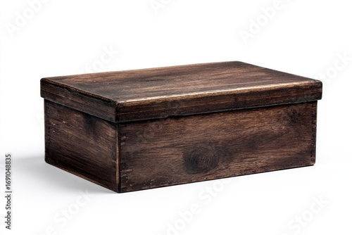 Dark rectangular wooden box with a lid positioned on a white surface with shadows