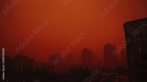 Dark red sky enveloping city skyline, thick smoky haze highlighting the devastating effects of wildfires and climate change.