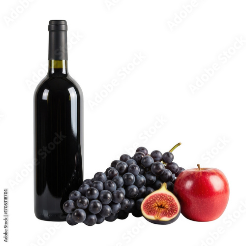 Dark red wine bottle with grapes apple and fig isolated on transparent background