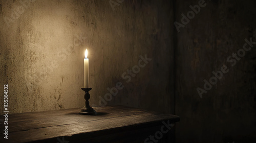 Dark room with single candle flickering on wooden table during power outage, symbolizing temporary darkness and reliance on alternative light sources.