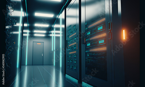 Dark servers data center room with computers. Storage systems corridor interior with glowing elements. Generative ai