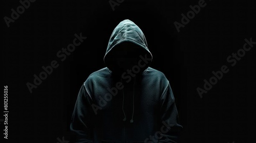 Dark silhouette of a mysterious person in a hooded sweatshirt with a faint glow on a completely black background, banner