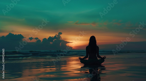 dark silhouette of a skinny female outline practicing yoga at sunset, embodying tranquility, strength, and balance against a vibrant sky, highlighting the union of mind and body