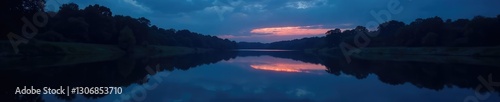 Dark skies reflect in the mirror-like surface of a slow-moving river at night, darkness, peaceful, calm