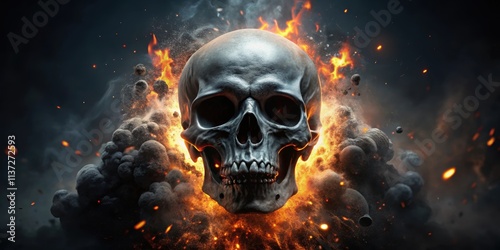 Dark skull with small explosions in background, skull, dark, explosion, fire, bone, death, scary, horror, macabre, Halloween