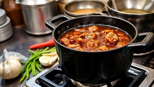 Dark soy sauce-based adobo bubbling in a cast iron pot on a stove, aromatic ingredients beside it, rustic kitchen background, commercial cooking scene, stock photo quality