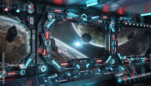 Dark spaceship interior with glowing blue and red lights. Futuristic spacecraft with large window view on planets in space. 3D rendering