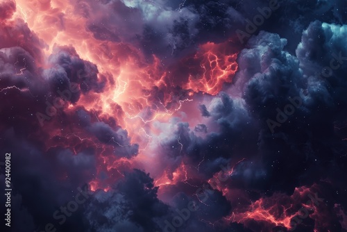 Dark Stormy Sky with Lightning Over Fantasy Cloudscape. Dramatic Ominous Clouds and Striking Flashes During Fierce Storm Background