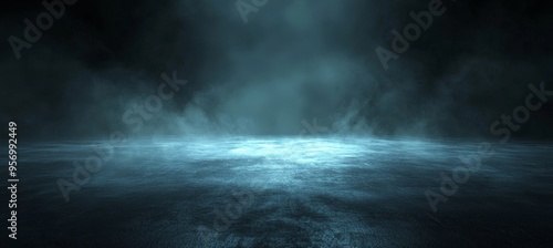 Dark street, abstract dark blue background, empty dark scene, neon light and spotlights. Concrete floor and studio room with smoke floats up the interior texture for display products.