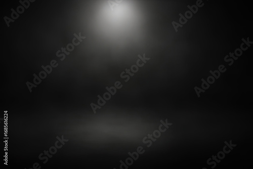 Dark studio with overhead spotlight, soft floor glow, elegant stage. Ideal for product photography, abstract art, virtual presentations, digital content, depth and sophisticated aesthetics.