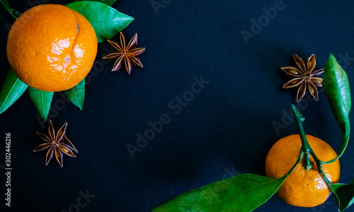 Dark textured christmas background with two tangerines, citrus leaves, star anise and cinnamon sticks. Background for banner, view from above.
